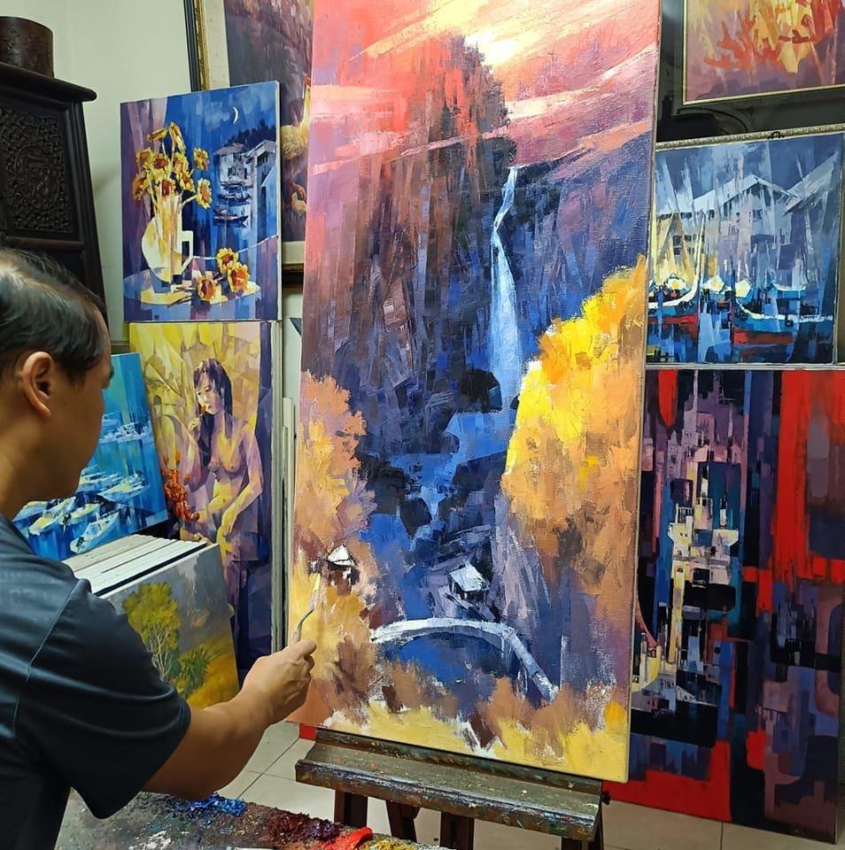 - 擅長使用顏料堆疊,致力於畫刀創作,使作品呈現強烈的切割感、立體感使其有豐富的凹凸質感。